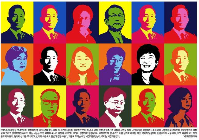 한겨레신문은 박근혜 대통령과 고 박정희 전 대통령, 국정농단 관련 인물들의 모습을 스텐실 기법으로 표현한 사진을 신문 전면에 내걸었다. 한겨레는 사진 설명에서 “2017년은 6월 항쟁 30주년이자 박정희 탄생 100주년을 맞는 해다. 두 사건의 중첩은 기묘한 인연이 아닐 수 없다. 2017년의 비틀린 시원을 찾아 나선 여정은 박정희라는 아이콘과 운명적으로 조우한다. 6월 항쟁으로 세상을 바꿨다고 생각했지만 우리가 사는 세상은 87년 체제가 아니라 박정희 체제였다”면서 “지금도 우리는 매일 박정희를 만난다. 우리는 박정희들인가”라고 게재했다.