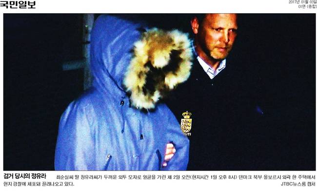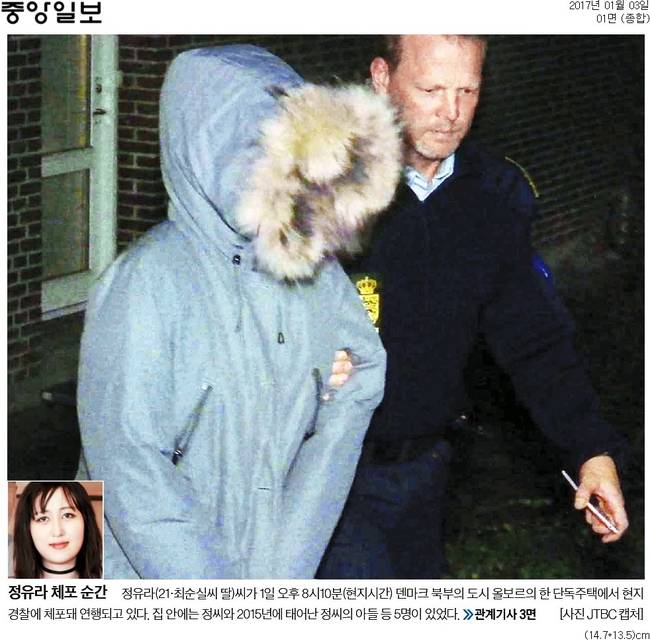 이화여대 입시 부정과 학사 특혜 혐의(업무방해)로 국내에서 지명수배가 내려진 최순실씨의 딸 정유라씨가 불법 체류 혐의로 덴마크 현지 경찰에 체포됐다. 경향신문과 국민일보, 서울신문, 중앙일보 등 대다수 조간신문은 3일 정유라씨의 체포 소식을 1면 사진에 담았다.