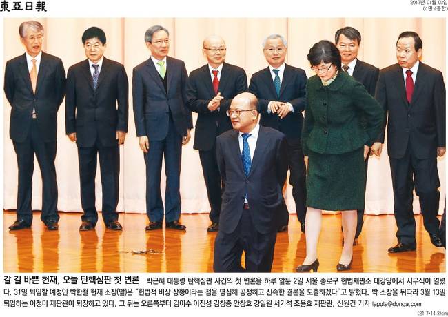 이날 동아일보는 탄핵 심판의 첫 변론을 앞둔 헌법재판소 모습을 1면 사진으로 보도했다. 동아에 따르면 박근혜 대통령 탄핵심판 사건의 첫 변론을 하루 앞둔 2일 서울 종로구 헌법재판소 대강당에서 시무식이 열렸다. 31일 퇴임할 예정인 박한철 헌재 소장은 “헌법적 비상 상황이라는 점을 명심해 공정하고 신속한 결론을 도출하겠다”고 밝혔다. 박 소장을 뒤따라 3월 13일 퇴임하는 이정미 재판관도 모습을 드러냈다.