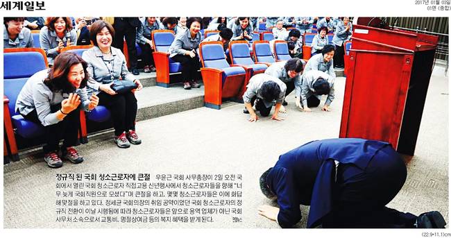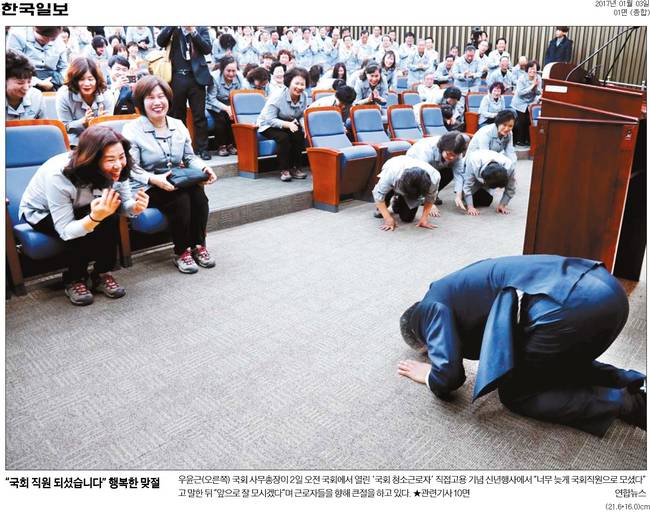 세계일보와 한국일보는 정규직이 된 국회 청소근로자에 큰절을 올리는 우윤근 국회 사무총장의 모습을 1면에 담았다. 세계에 따르면 우 사무총장은 국회에서 열린 국회 청소근로자 직접고용 신년행사에서 청소근로자를 향해 “너무 늦게 국회직원으로 모셨다”며 큰절을 하고, 몇몇 청소근로자들은 이에 화답해 맞절했다. 정세균 국회의장의 취임 공약이었던 국회 청소근로자의 정규직 전환이 이날 시행됨에 따라 청소근로자들은 앞으로 용역업체가 아닌 국회 사무처 소속으로서 교통비, 명절상여금 등 복지혜택을 받게 됐다.