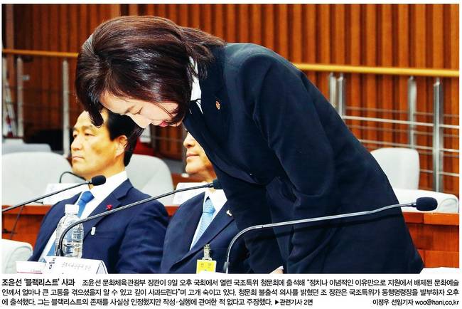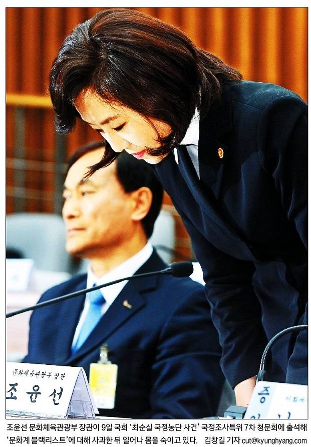 조윤선 문화체육관광부 장관이 '문화계 블랙리스트' 존재를 인정했다. 그동안 조 장관은 블랙리스트에 '모르쇠'로 일관해 왔다. 조 장관은 9일 최순실 국정농단 국정조사 특별위 7차 청문회에서 의원들의 질문에 "예술인들의 지원을 배제하는 명단은 있었던 것으로 판단된다"고 말했다.