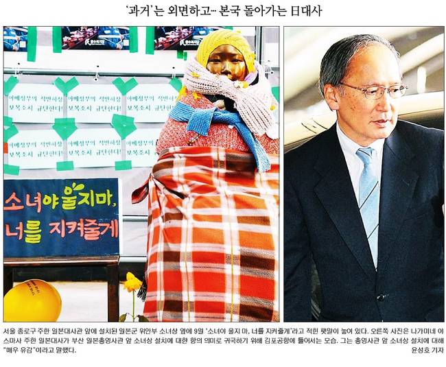 동아일보는 "부산 일본총영사관 앞 위안부 소녀상 설치에 항의하고 있는 일본 정부가 결국 대사를 소환했지만 한국 정부는 상황을 관리하면서 한일 갈등의 수위를 조절한다는 방침을 유지하고 있다"고 보도했다.