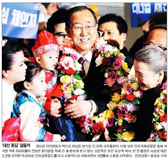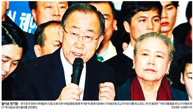 13일 국민일보, 서울신문, 세계일보, 조선일보, 한겨레, 한국일보는 반 전 총장의 모습을 1면에 싣고 정치적 메시지를 분석했다.