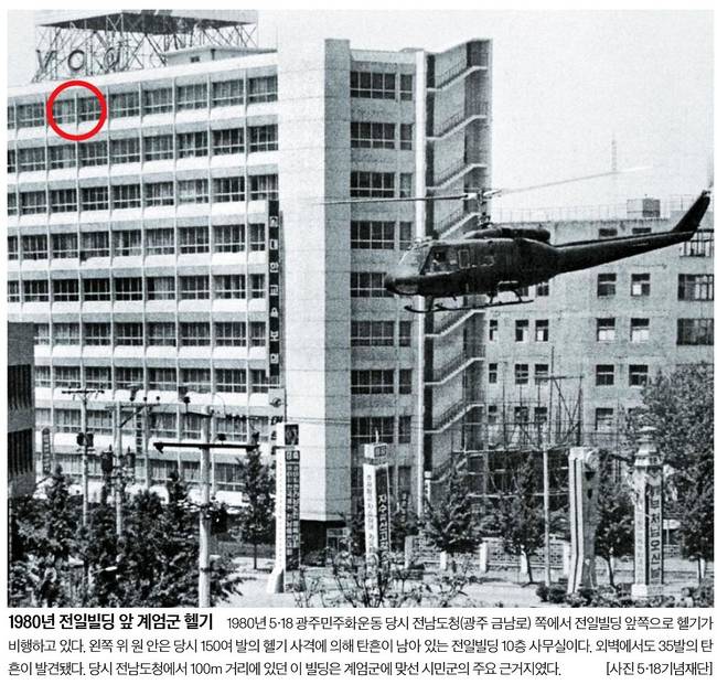 중앙일보는 1980년 5·18광주민주화운동 당시 계엄군에 맞선 시민군의 주요 근거지였던 광주 금남로 전남도청 근처 전일빌딩과 앞쪽으로 헬기가 비행하는 모습을 1면에 실었다.