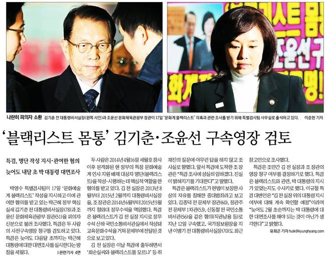 주요 종합일간지는 18일자 1면 사진으로 김기춘 전 대통령비서실장과 조윤선 문화체육관광부 장관이 전날 '문화계 블랙리스트' 의혹과 관련 조사를 받기 위해 특별검사팀 사무실로 출석하고 있는 모습을 주요하게 다뤘다.