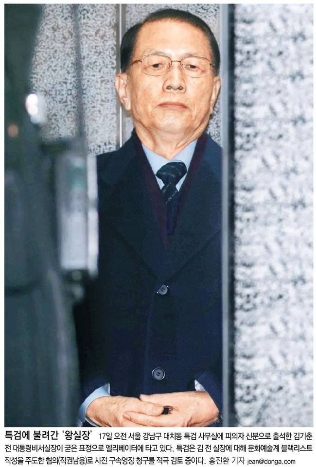 동아일보는 17일 오전 서울 강남구 대치동 특검 사무실에 피의자 신분으로 출석한 김기춘 전 대통령비서실장이 굳은 표정으로 엘리베이터에 타고 있는 장면을 실었다.