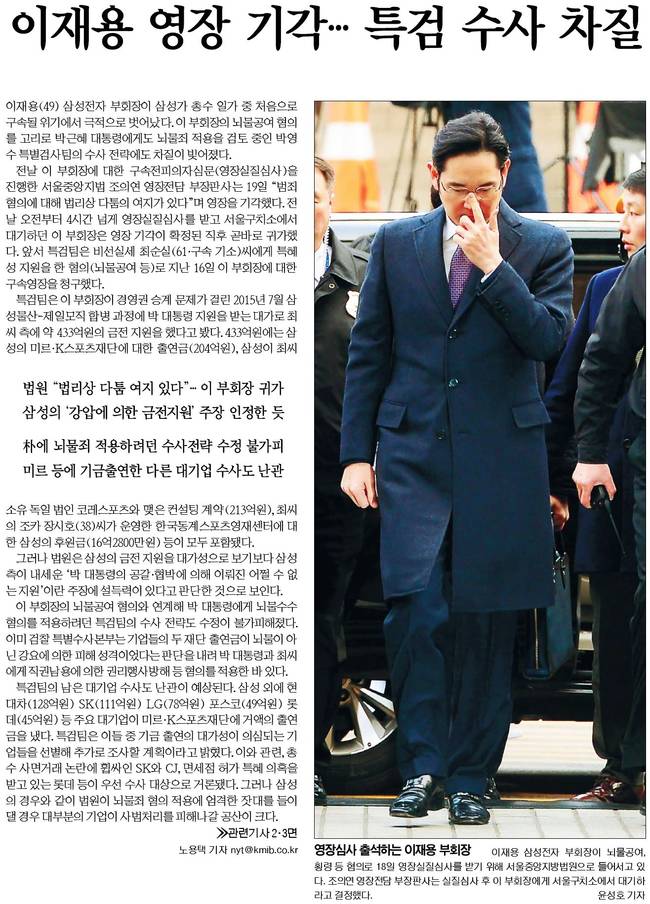 국민일보는 이 부회장이 뇌물공여, 횡령 등 혐의로 18일 영장실질심사를 받기 위해 서울 중앙지방법원으로 들어서고 있는 장면을 실었다.