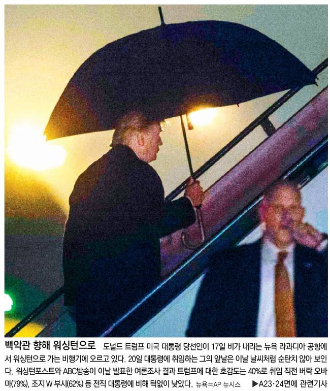 20일 대통령에 취임하는 그의 앞날은 이날 날씨처럼 순탄치 않아 보인다고 동아일보는 전했다. 위싱턴포스트와 ABC방송이 이날 발표한 여론조사 결과 트럼프에 대한 호감도는 40%로 취임 직전 버락 오바마(79%), 조지W 부시(62%) 등 전직 대통령에 비해 턱없이 낮았다.