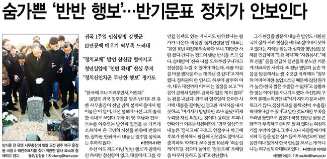 한겨레는 "귀국 뒤 영‧호남과 진보‧보수를 아우르는 발언과 일정을 숨 가쁘게 소화하며 온 국민의 시선을 한 몸에 받았지만, 정치권 안팎에서 내놓은 일주일 성적표는 후하지 않다"고 지적했다. 이어 "우선 이도 저도 아닌 '반반 행보'가 광폭이긴 하지만 참신함이 없고, 대중에게 그를 각인할 임팩트 있는 메시지도 빈약했다는 평가가 나온다"고 덧붙였다.