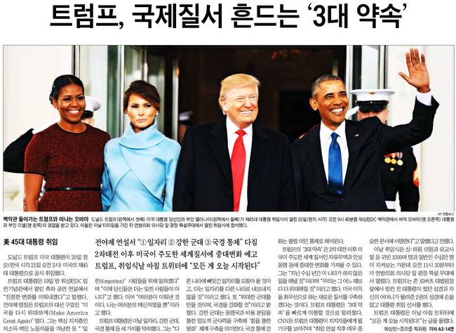 조선일보는 "트럼프 대통령은 이날 일자리, 강한 군대, 국경 통제 등 세 가지를 약속했다"며 "트럼프의 '3대 약속'은 2차 대전 이후 미국이 주도한 세계 질서인 자유무역과 안보 동맹 등에 중대한 변화를 가져올 수 있다"고 진단했다.