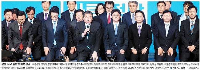 바른정당 중앙당 창당대회가 24일 서울 방이동 올림픽홀에서 열렸다. 중앙일보는 정병국 대표 등 지도부가 무릎을 꿇고 대국민 사과를 하고 있는 모습을 1면 사진으로 전했다. 중앙일보는 “바른정당 소속 의원 31명은 ‘박근혜 대통령의 헌법 유린과 국정 농단을 막지 못한 과오를 사죄드린다’며 단상에 나와 무릎을 꿇고 국민들에게 사죄를 표시했다”며 “당 대표에 추대된 정병국 의원은 ‘기득권을 옹호하는 가짜 보수가 아닌 자유민주주의와 공화주의라는 보수의 진정한 가치를 지키겠다’고 다짐했다”고 보도했다.