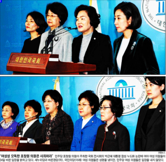 박 대통령 합성 누드화 국회 전시 파문에 주목한 신문도 있었다. 조선일보는 표창원 더불어민주당 의원이 주최한 국회 전시회의 박 대통령 합성 누드화 논란에 여야 여성 의원들이 24일 비판 입장을 밝히고 있는 모습을 1면 사진으로 전했다.
