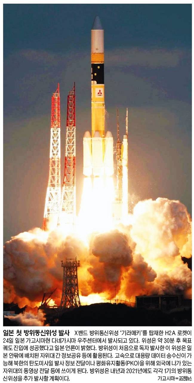 세계일보는 일본의 첫 방위통신위성 발사에 주목했다. 세계일보는 X밴드 방위통신위성 ‘기라메키’를 탑재한 H2A 로켓이 24일 일본 가고시마현 다네가시마 우주센터에서 발사되고 있는 모습을 1면 사진으로 전했다. 세계일보는 “위성은 약 30분 후 목표 궤도 진입에 성공했다고 일본 언론이 밝혔다”면서 “방위성이 처음으로 독자 발사한 이 위성은 일본 안팎에 배치된 자위대 간 정보공유 등에 활용된다. 고속으로 대용량 데이터 송수신이 가능해 북한의 탄도미사일 발사 정보 전달이나 평화유지활동(PKO)을 위해 외국에 나가 있는 자위대의 동영상 전달 등에 쓰이게 된다”고 보도했다.