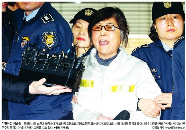 동아일보는 박영수 특별검사팀에서 강제 구인된 최순실씨가 25일 오전 서울 강남구 대치동 특검사무실 건물로 들어오면서 취재진을 향해 "특검이 자백을 강요하고 있다. 너무 억울하다" "더 이상 자유민주주의 특검이 아니다"라며 소리치는 장면을 실었다.
