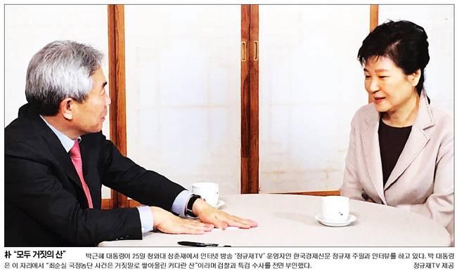 박 대통령은 이날 오후 3시쯤 인터넷 방송 ‘정규재TV’와 비공개로 단독 인터뷰를 진행하고 “(이번 사건은) 한마디로 거짓말로 쌓아올린 커다란 산이자 가공의 산”이라며 “오래전부터 누군가 기획하고 관리한 것 같다”고 주장했다.