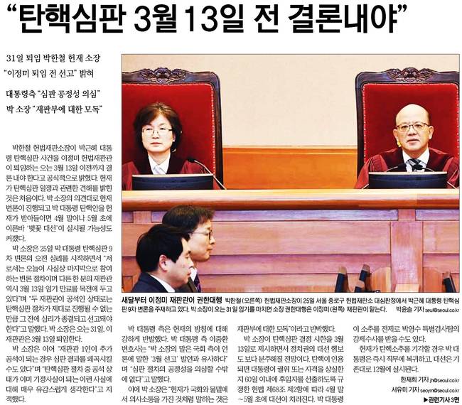 서울신문은 박한철(오른쪽) 헌법재판소장이 25일 서울 종로구 헌법재판소 대심판정에서 박근혜 대통령 탄핵심판 9차 변론을 주재하고 있는 장면을 담았다. 박한철 헌법재판소장은 이날 박근혜 대통령 탄핵심판 사건을 이정미 헌법재판관이 퇴임하는 오는 3월13일 이전까지 결론 내야 한다고 공식적으로 밝혔다.