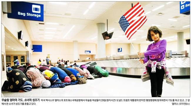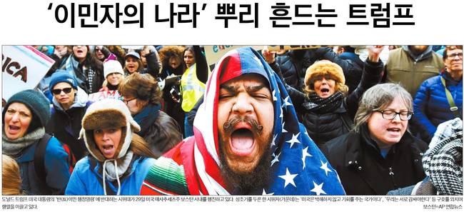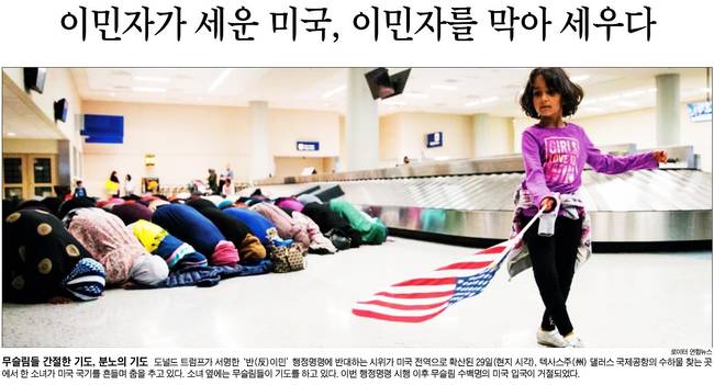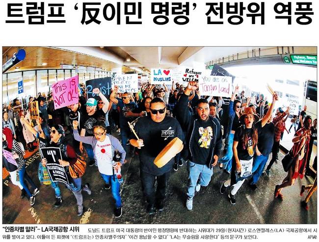 도널드 트럼프 미국 대통령이 이슬람 7개국 국민의 미국 입국을 제한하는 행정명령에 서명하면서 이에 항의하는 시위가 잇따르고 있다. 31일 종합일간지 대부분은 미국 공항에서 벌어진 '반(反)이민 행정명령 반대 시위' 모습을 1면에 실었다.