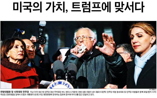 조선일보는 도널드 트럼프 미국 대통령의 '반(反)이민 행정명령'에 반발한 미국 야당과 시위대의 모습을 1면에 실었다.