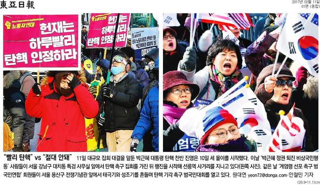 동아일보는 “다음달 초 헌법재판소의 박근혜 대통령 탄핵 소추안 심판 선고가 유력해지면서 정월 대보름인 11일 탄핵 찬성의 촛불과 반대의 태극기가 힘겨루기를 예고하고 있다. 양 진영은 여야 정치권까지 편승해 총동원령을 내리며 세 대결에 집중했다”고 전했다.