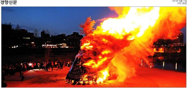 이날 경향신문과 서울신문, 조선일보 등의 조간신문은 뚝 떨어진 기온 속에 맞이한 정월대보름 소식을 1면으로 보도했다. 경향은 “정월대보름을 하루 앞둔 10일 저녁 서울 서초구 양재천에서 열린 ‘정월 대보름 달맞이’ 축제에서 시민들이 달집 태우기 행사를 보며 소원을 빌고 있다”고 했다.