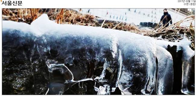 서울신문은 고드름이 맺힌 서울 청계천로를 걷는 한 시민의 모습을 1면에 담았다. 서울은 “11일 서울 아침 영하 9도로 떨어지는 등 전국적으로 강추위가 기승을 부리겠다”고 예보했다. 서울에 따르면 기상청은 중국 중부지방에 자리잡은 찬 대륙고기압의 영향으로 기온이 큰 폭으로 떨어지고, 바람까지 강하게 불어 주말에도 매서운 추위가 이어진다고 설명했다.