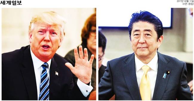 세계일보와 중앙일보는 도널드 트럼프 미국 대통령과 아베 신조 일본 총리의 첫 정상회담 소식을 1면에 담았다. 세계에 따르면 이들은 미일 동맹 강화 방안과 북한에 대한 공동대응, 경제와 통상 문제 등에 대해 의견을 나눴다. 정상회담을 하루 앞둔 9일 트럼프 대통령은 기업의 세금부담을 낮춰주는 게 중요하다고 강조했다.