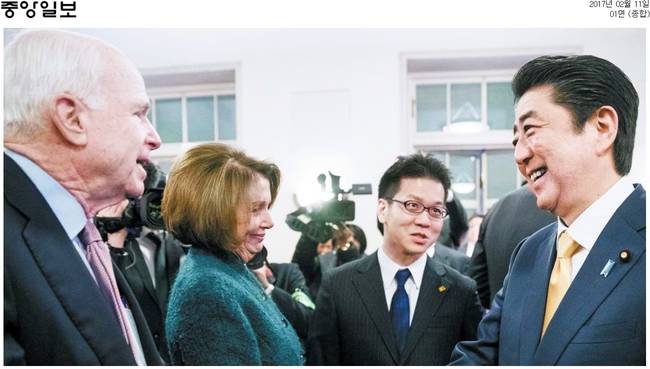 중앙일보는 “2박3일 일정으로 방미 중인 아베 신조 일본 총리가 10일 미국 상공회의소 주최 오찬 행사에서 존 매케인 상원 군사위원장과 낸시 펠로시 민주당 하원 원내대표 등과 대화를 나눴다”고 덧붙였다.