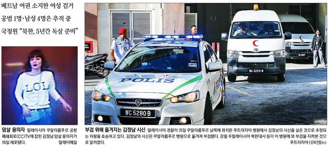 경향신문은 폐쇄회로 TV에 잡힌 암살용의자의 모습과 부검을 위해 김정남의 시신이 실린 것으로 추정되는 차량이 호송되는 모습을 나란히 신문 전면에 내걸었다. 경향은 관련기사에서 “경찰은 범행 약 48시간 만인 이날 오전 8시20분(현지시간) 베트남행 비행기를 타려고 공항에 온 드안 티 흐잉(28)을 체포했다. 경찰은 당시 공항 폐쇄회로(CCTV)에 찍힌 여성이라고 확인했다”고 보도했다. 경향은 “김정남의 시신은 이날 오전 쿠알라룸푸르 남쪽 푸트라자야 병원에서 쿠알라룸푸르 병원으로 옮겨진 뒤 부검됐다. 북한 측은 당초 부검을 거부하며 시신 인도를 요구했다고 로이터 통신이 전했다”고 게재했다.