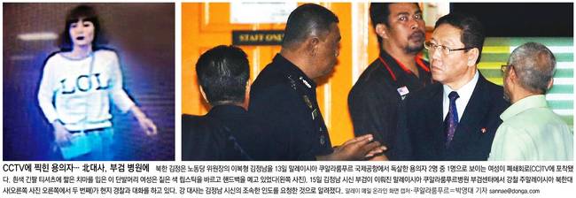 동아일보는 CCTV에 찍힌 용의자의 모습과 주말레이시아 북한 대사가 현지 경찰과 대화하는 모습을 1면에 담았다. 동아는 관련기사에서 “국가정보원은 김정남 독살이 5년 전부터 북한 당국 차원에서 치밀하게 계획한 범행이라고 밝혔다”며 “이병호 국정원장은 이날 국회 정보위원회 간담회에 출석해 ‘김정남 암살은 김정은 집권 이후 ’스탠딩 오더‘, 반드시 처리해야 하는 명령에 따른 것’이라고 했다”고 보도했다. 그러면서 “2009년 후계자로 지목된 김정은은 집권전이자 아버지 김정일이 생존해 있던 2009년과 2010년에도 각각 평양과 중국 베이징에서 김정남 암살을 시도했던 것으로 알려졌다”고 덧붙였다.