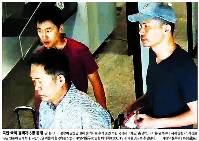주요 신문들은 20일자 1면 사진기사로 전날 말레이시아 경찰이 김정남 살해 용의자로 추적 중인 북한 국적자 리재남, 홍성학, 리지현(왼쪽부터 시계방향)의 사진을 19일 언론에 공개한 소식을 주요하게 다루었다.