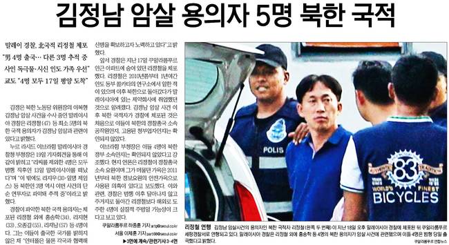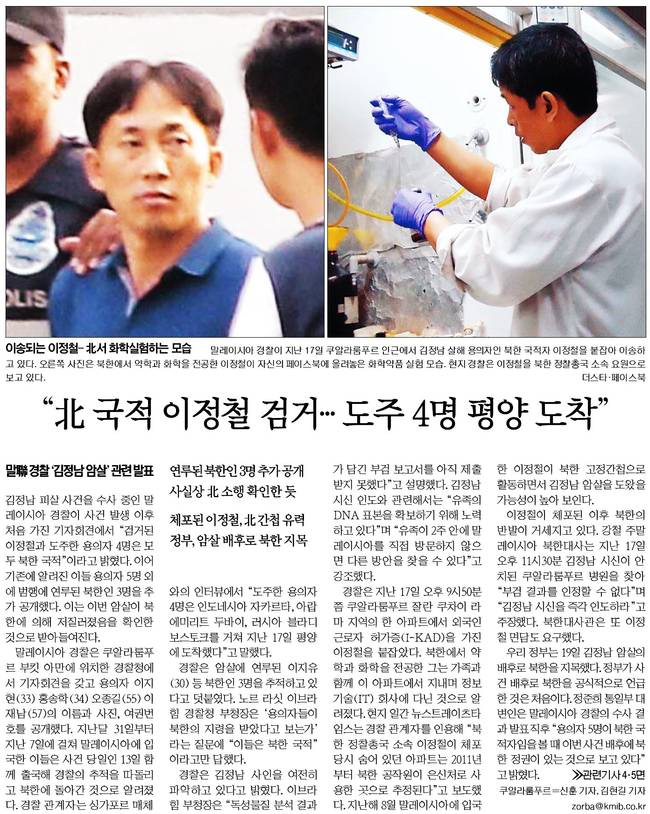 국민일보는 말레이시아 경찰이 지난 17일 쿠알라룸푸르 인근에서 김정남 살해 용의자인 북한 국적자 리정철을 붙잡아 이송하는 모습과 북한에서 약학과 화학을 전공한 리정철이 자신의 페이스북에 올려놓은 화학약품 실험 모습(왼쪽 사진)을 실었다. 현지경찰은 이정철을 북한 정찰총국 소속 요원으로 보고 있다고 국민일보는 덧붙였다.