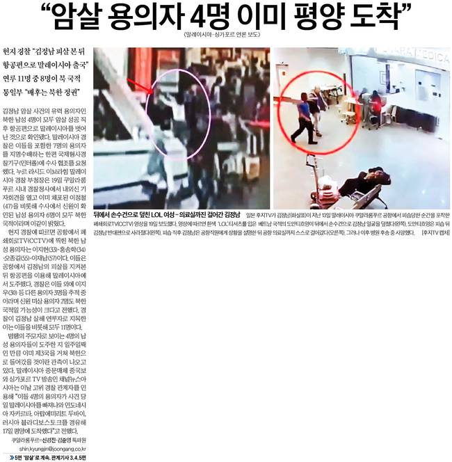 하지만 "출국한 4명이 이미 평양에 도착했다는 보도도 있어, 수사가 난항을 겪을 가능성도 제기된다. 싱가포르 매체인 채널뉴스아시아 등은 고위 경찰 관계자의 말을 인용해 주요 용의자 4명이 인도네시아 자카르타, 아랍에미리트연합 두바이, 러시아 블라디보스토크를 경유해 지난 17일 평양에 도착했다고 전했다"고 덧붙였다.