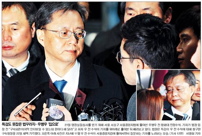 중앙일보는 우병우 전 민정수석이 21일 서울중앙지법에서 5시간20분 동안 영장실질심사를 받은 뒤 서울구치소로 가는 차에 타고 있는 장면을 실었다.