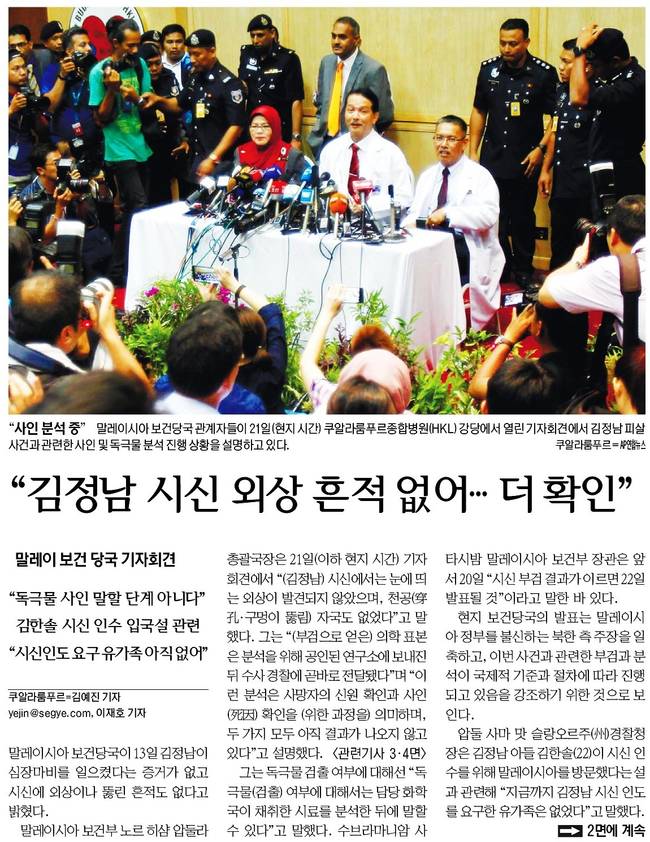 이날 말레이시아 보건당국은 13일 김정남이 심장마비를 일으켰다는 증거는 없고 시신에 외상이나 뚫린 흔적도 없다고 밝혔다. 독극물 검출여부에 대해선 "독극물(검출) 여부에 대해서는 담당 화학국이 채취한 사료를 분석한 뒤에 말할 수 있다"고 설명했다.