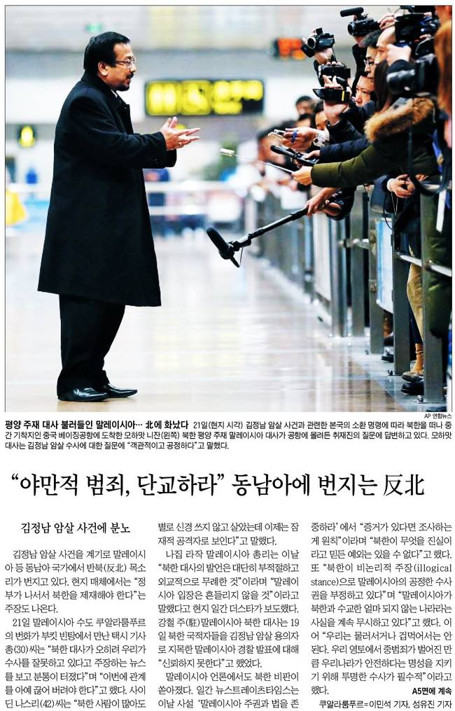 동아일보는 21일 오전 2시30분경(현지시간) 암살된 김정남의 시신이 안치된 말레이시아 쿠알라룸푸르병원 부검센터 앞에 배치된 말레이시아 경찰특공대원들이 복면을 쓰고 무장한 채 경계태세를 취하고 있는 모습을 담았다.
