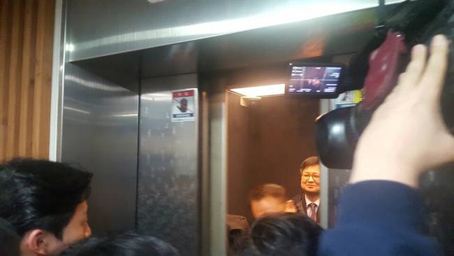 ▲23일 열린 방문진 임시이사회에서 김장겸 보도본부장이 면접과 프레젠테이션을 마치고 취재진의 질문에 답변하지 않고 나가는 모습.