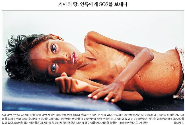 국민일보는 유니세프(유엔아동기금)가 중동과 아프리카의 심각한 기근 사태를 알리기 위해 22일(현지시간) 공개한 사진을 실었다.