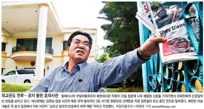 동아일보는 말레이시아 쿠알라룸푸르의 북한대사관 직원이 23일 정문에 나와 배달된 신문을 가져가면서 취재진에게 신경질적인 반응을 보이는 모습을 담았다. 대사관에는 김정남 암살 사건의 북한 국적 용의자인 2등 서기관 현광성과 고려항공 직원 김욱일이 은신 중인 것으로 알려졌다.