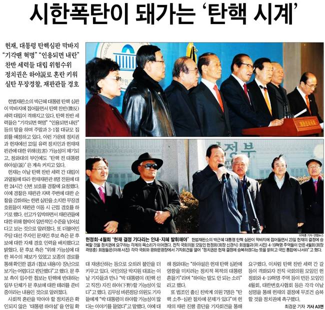 조선일보는 "헌법재판소의 박근혜 대통령 탄핵 심판이 막바지에 접어들면서 23일 헌재의 결정에 승복할 것을 정치권에 요구하는 각계의 목소리가 이어졌다"고 밝혔다.