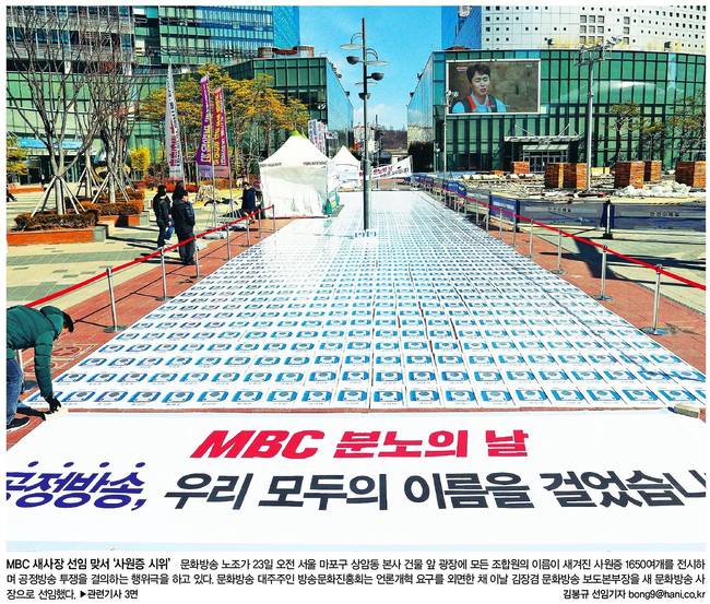 한겨레는 MBC 노조가 23일 오전 서울 마포구 상암동 본사 건물 앞 광장에 모든 조합원의 이름이 새겨진 사원증 1650여개를 전시하며 공정방송 투쟁을 결의하는 행위극을 하고 있는 모습을 실었다. MBC 대주주인 방송문화진흥회는 언론개혁 요구를 외면한 채 이날 김장겸 보도본부장을 새 MBC 사장으로 선임했다.