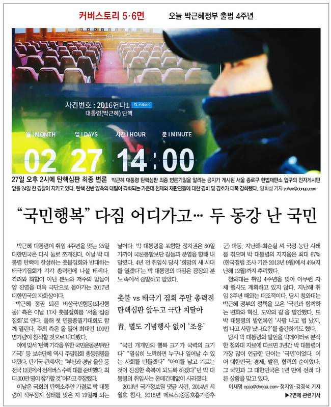 동아일보는 "박근혜 대통령이 취임 4주년을 맞는 25일 대한민국은 다시 둘로 쪼개진다. 이날 박 대통령 탄핵에 찬성하는 촛불집회와 반대하는 촛불집회와 반대하는 태극기집회가 각각 총력전에 나설 태세"라고 밝혔다.