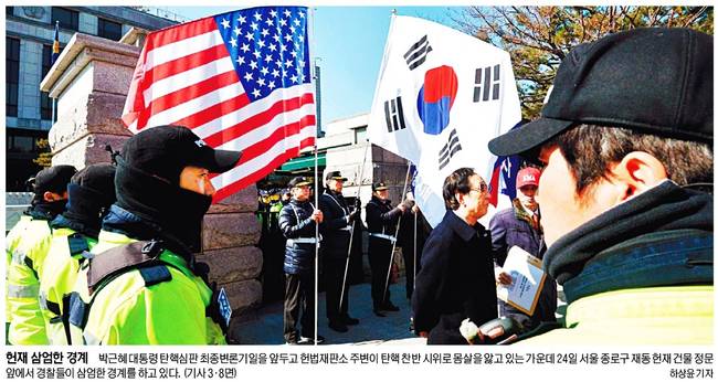 동아일보는 박근혜 대통령 탄핵심판 최종 변론기일을 알리는 공지가 게시된 서울 종로구 헌법재판소 입구의 전자게시판 앞을 24일 한 경찰이 지키고 있는 모습을 담았다. 탄핵 찬반 양측의 대립이 격화되는 가운데 헌재와 재판관들에 대한 경비 및 경호가 대폭 강화됐다고 동아일보는 전했다.