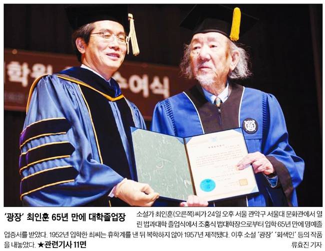 한국일보는 소설가 최인훈(오른쪽)씨가 24일 오후 서울 관악구 서울대 문화관에서 열린 법과대학 졸업식에서 조홍식 법대학장으로부터 입학 65년 만에 명예졸업증명서를 받는 모습을 실었다. 1952년 입학한 최씨는 휴학계를 낸 뒤 복학하지 않아 1957년 제적됐다. 이후 소설 '광장' '회색인' 등의 작품을 내놓았다.