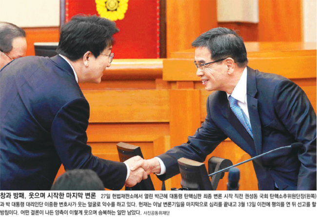 동아일보는 27일 헌재에서 열린 최종변론 시작 직전 권성동 국회 탄핵소추위원단장과 박 대통령 대리인단 이중환 변호사가 웃는 얼굴로 악수하고 있는 모습을 1면 사진으로 전했다. 동아일보는 “박 대통령은 이날 헌재에 출석하지 않고 서면 형태의 최후진술을 통해 국정 농단 사건에 대한 기존 주장을 반복했다”며 “이날 최종변론에서 국회 탄핵소추위원단은 권성동 단장과 황정근 변호사 등 4명이 74분 만에 변론을 마쳤다. 반면 박 대통령 측은 15명의 변호사가 291분 동안 ‘마라톤 변론’을 이어가며 맞섰다”고 보도했다.