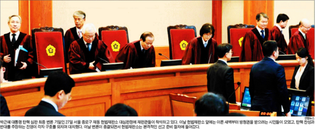 조선일보는 27일 헌재 대심판정에 재판관들이 착석하고 있는 모습을 1면 사진으로 전했다. 조선일보는 “이날 헌재 앞에는 이른 새벽부터 방청권을 받으려는 시민들이 모였고, 탄핵 찬성과 반대를 주장하는 진영이 각자 구호를 외치며 대치했다”며 “6시간 30분 넘게 진행된 이날 최후변론에서 국회 소추인단 측과 박 대통령 대리인단 측은 탄핵 사유의 정당성과 탄핵 절차의 합법성 등을 놓고 막바지 공방을 벌였다”고 보도했다.