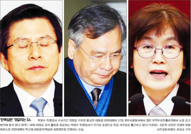 국민일보는 박영수 특별검사 수사기간 연장을 거부한 황교안 대통령 권한대행이 27일 정부서울청사에서 열린 무역투자진흥회의에서 눈을 감고 생각에 잠겨 있는 모습과 28일로 공식 활동을 종료하는 박영수 특별검사가 무거운 표정으로 특검 사무실로 출근하고 있는 모습, 이정미 헌법재판소장 권한대행이 박 대통령 탄핵심판 최종변론을 진행하는 모습을 연달아 1면 사진으로 실었다. 국민일보는 “최후진술을 마친 국회 소추위원 측은 ‘대한민국은 민주공화국이며 헌법의 지배를 받는 국가’라며 헌법재판소 결정에 승복하겠다고 명확히 밝혔다”면서 “반면 박 대통령 측은 ‘더 이상 다툴 방법은 없다’면서도 ‘재심 인정 여부에 논란이 있는 건 틀림없다’고 언급했다”고 보도했다.
