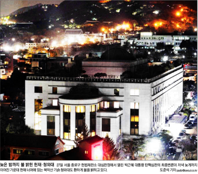 서울신문은 27일 헌재 대심판정에서 열린 박 대통령 탄핵심판의 최종변론이 저녁 늦게까지 이어진 가운데 헌재 너머에 있는 북악산 기슭 청와대가 환하게 불을 밝히고 있는 모습을 1면 사진으로 전했다. 서울신문은 “이정미 헌재소장 권한대행은 양측의 변론을 마무리한 뒤 ‘헌법적 가치를 제시해 국가적 사회적 혼란 상태를 조속히 안정시켜야 하는 책무가 있음을 알고 있고 매우 무거운 책임감을 느끼고 있다’며 ‘재판부는 예단과 편견 없이 헌법과 법률이 정한 절차에 따라서 실체를 파악해 결론을 내리기 위해 모든 노력을 다할 것’이라고 말했다”고 보도했다.