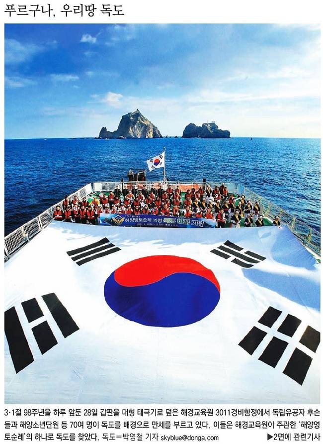 동아일보는 3·1절 98주년을 하루 앞둔 28일 갑판을 대형 태극기로 덮은 해경교육원 3011경비함정에서 독립유공자 후손들과 해양소년단원 등 70여명이 독도를 배경으로 만세를 부르고 있는 모습을 1면 사진으로 전했다. 동아일보는 ‘3·1절이 부끄럽다’는 제목의 기사에서 “3·1절 당일 대한민국은 또 일촉즉발의 상황을 맞는다. 대한민국 건국정신, 헌법정신의 뿌리가 된 3·1독립운동을 기념하고 한마음으로 순국선열을 추념해야 하는 날에 서울 광화문광장에선 완충지대 없이 박 대통령 탄핵 찬반 대규모 집회가 동시에 열려 과열된 민심의 충돌이 우려된다”며 “지금까지 탄핵 찬성 집회는 광화문광장에서, 반대 집회는 서울광장에서 열려 300m의 완충지대가 있었다. 하지만 1일 집회에선 이마저 사라진다. 경찰은 기동대 202개 중대를 투입하고 차벽을 설치할 계획”이라고 보도했다.