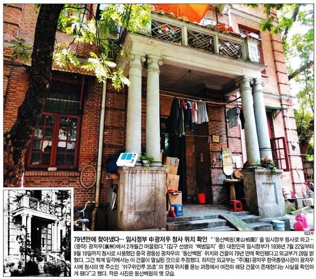 조선일보는 79년 만에 찾아낸 임시정부 청사의 모습을 1면 사진으로 전했다. 조선일보는 “대한민국 임시정부가 1938년 7월22일부터 9월19일까지 청사로 사용했던 중국 광동성 광저우의 ‘동산백원’ 위치와 건물이 79년 만에 확인됐다고 외교부가 28일 밝혔다”면서 “그간 학계 일각에서는 이 건물이 멸실된 것으로 추정했다. 하지만 외교부는 ‘주 광저우 한국총영사관이 광저우시에 청사의 옛 주소인 ‘쉬구위안루 35호’의 현재 위치를 묻는 과정에서 여전히 해당 건물이 존재한다는 사실을 확인하게 됐다’고 했다”고 보도했다.