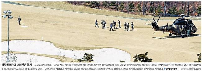 고고도미사일방어(THAAD·사드) 체계가 들어설 경북 성주를 주목한 신문도 있었다. 중앙일보는 이날 사드 체계가 들어설 경북 성주군 롯데스카이힐 성주골프장에 28일 오후 군 헬기가 착륙한 모습을 1면 사진으로 전했다. 중앙일보는 “헬기에서 내린 군 관계자들이 현장을 살펴보고 있다”며 “이날 국방부와 롯데그룹은 성주골프장과 경기도 남양주 군 용지 교환 계약을 체결했다. 계약 체결 뒤 군은 성주골프장을 군사시설보호구역으로 설정해 경계병을 배치하고 울타리 설치 작업을 시작했다”고 보도했다.
